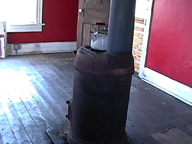 | This is what the kitchen looked like when we bought the house. The old coal parlor stove was connected to a half chimney. The previous owners were still using it to heat the room. |