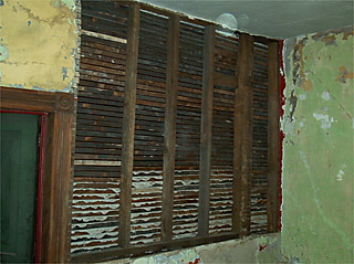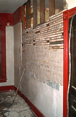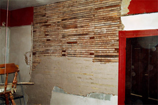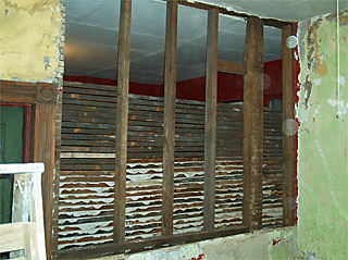 | This is a view from the kitchen to the back of the wall. Notice the plaster smeared through the lath or "keys." | Another view with the lath carried all the way to the top of the wall. This side will be done later. |