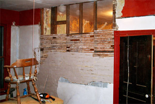 | After framing the space with old 2x4 timbers, I cut and renailed lath to the studs. I also installed a horizontal stud at the top for hanging a heavy picture frame. | The portion of the wall to the left of the repair into the corner was drywall which I ripped down to put up new plaster. |